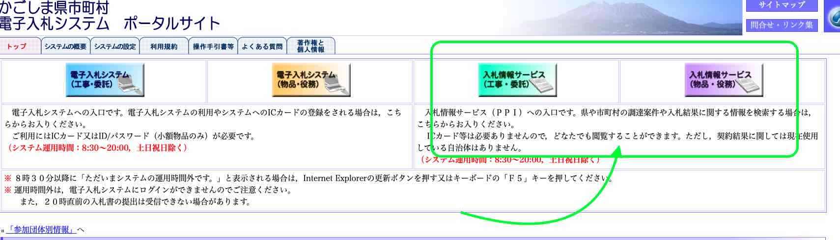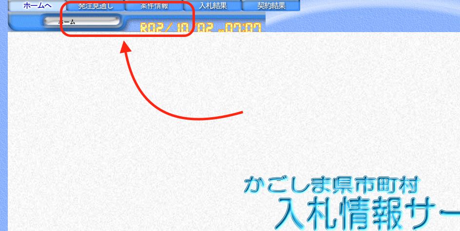 入札結果を探すときに開いた、かごしま県市町村電子入札システムポータルサイトを開いてみてください。