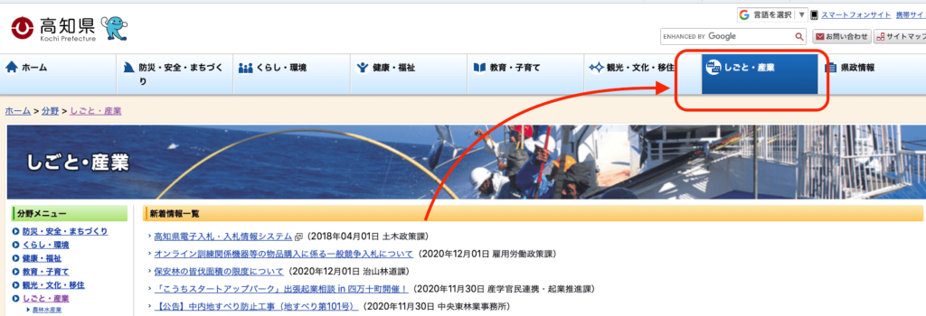 まず「しごと・産業」をクリック。
