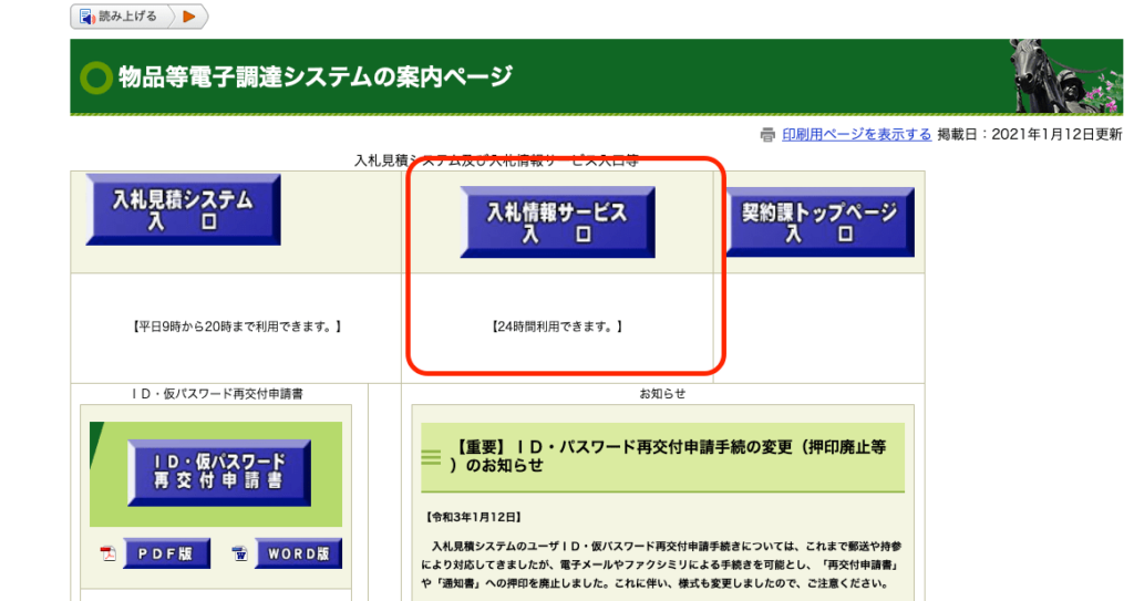 先ほど開いた「建設工事等電子入札システム」の「入札情報サービス入口」を再度クリック。