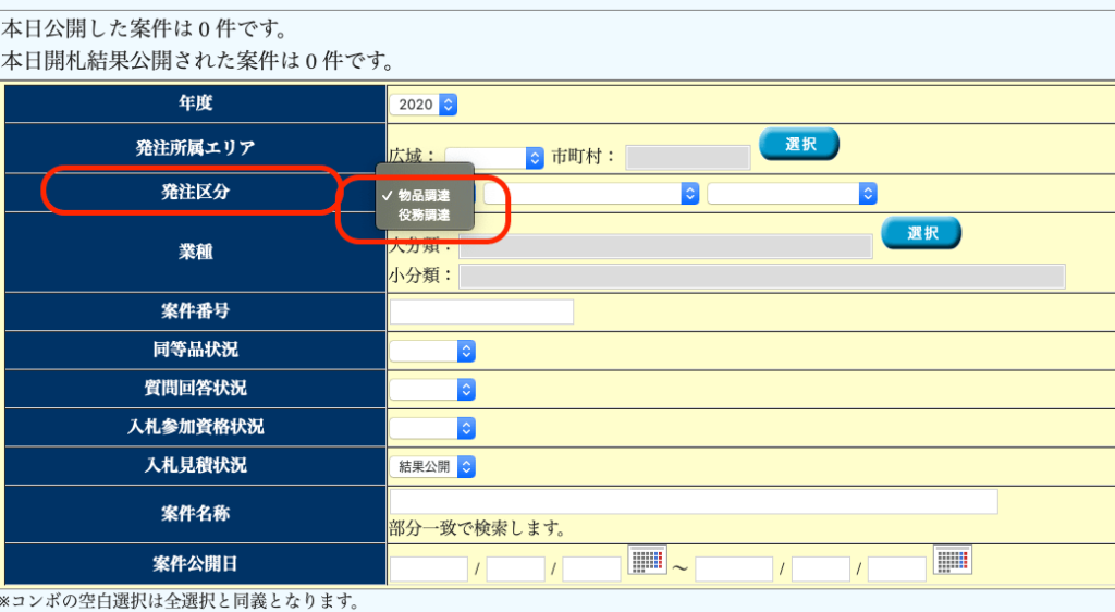 ここで、「発注区分」のプルダウンメニューを開くと、「物品調達」と「役務調達」があります。