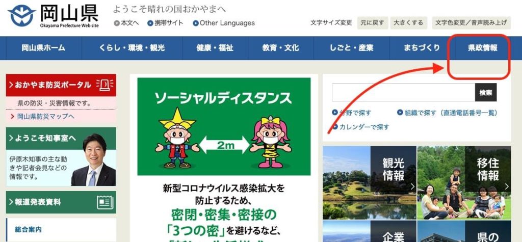 先ほどと同じように、岡山県公式サイト「県政情報」をクリックし、下にスクロール。
