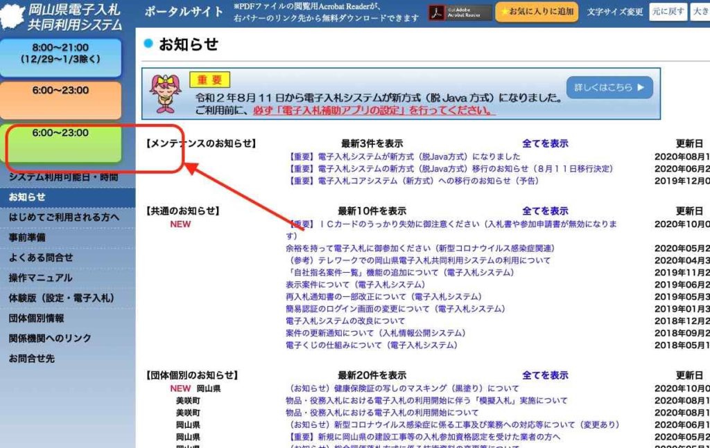 | 岡山県電子入札共同利用システムとは、岡山県と岡山県内市町村が共同運営する、入札情報を集めたサイトです。 |