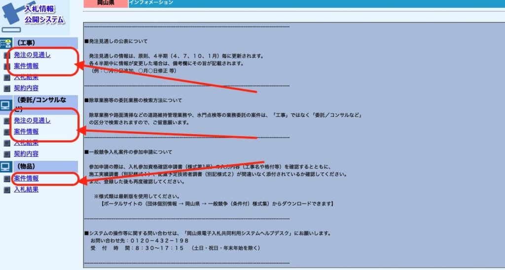 岡山県入札に関するお知らせには、「入札見通し」と「入札案内」があります。