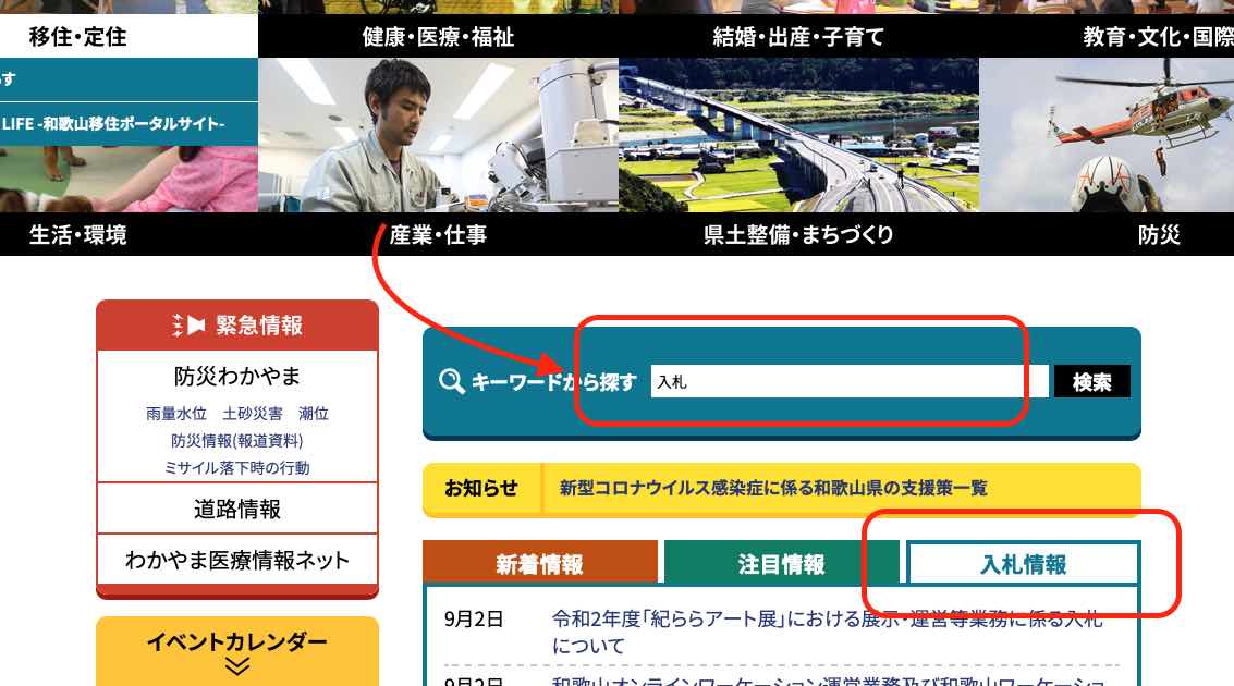 和歌山県公式サイトのトップページには、中央のところに検索欄と新しい入札情報の欄があります。